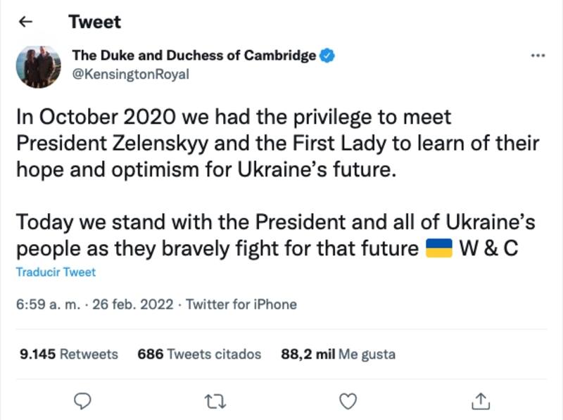 Después de que Meghan Markle y el príncipe Harry hicieran lo mismo en un comunicado a través de su fundación Archewell, en el que suscribieron: "Estamos con el pueblo de Ucrania", los Duques de Cambridge expresaron su postura.