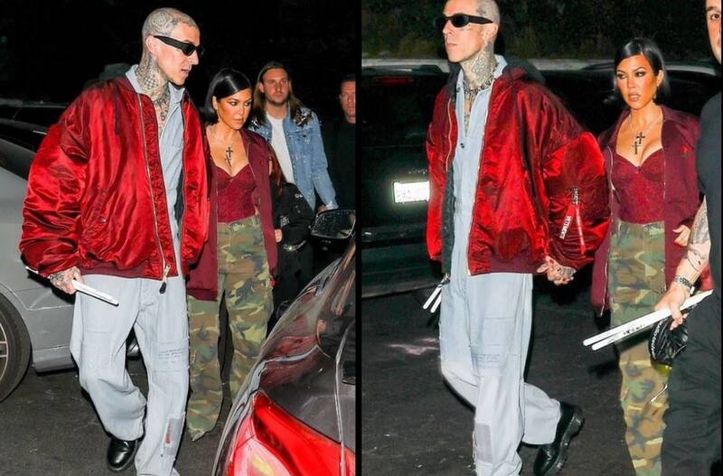Para la velada, Kourtney Kardashian portó un pantalón estilo militar con una chaqueta color rojo y zapatillas en punta color plata. En tanto, el músico usó un atuendo completo en mezclilla que acompañó con una bomber jacket en color rojo, botas negras y lentes oscuros.