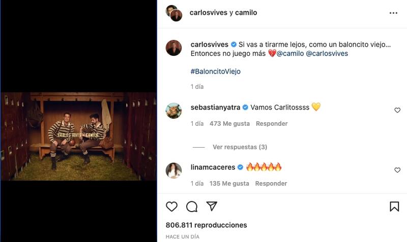 "Como pueden ver, soy fan de Carlos Vives, ahora ya pueden entender lo mucho que puede significar para mí no solo como cantautor, sino para mí como cantautor colombiano tener una canción con Carlos Vives. Este miércoles, 'Boloncito viejo'".