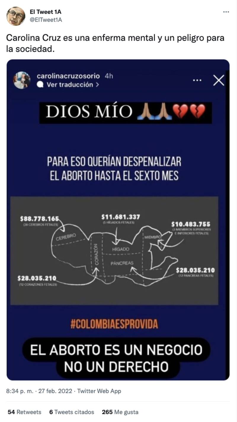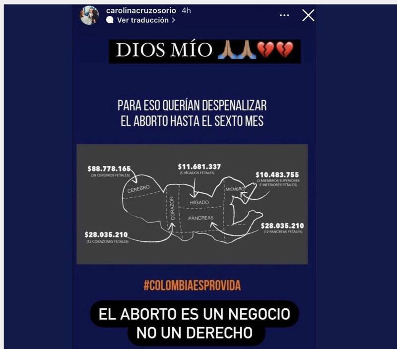 Pues bien, en la publicación de Carolina Cruz se habla de presuntamente, cuánto se pagaría por los órganos de un bebé de 24 semanas de gestación. "Dios mío, para eso querían despenalizar el aborto hasta el sexto mes", fue lo escrito en la publicación en la que se ve el croquis de un bebé y los supuestos pagos que se harían por cada órgano.