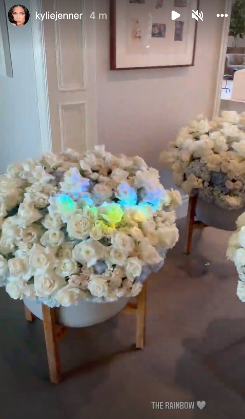 Momentos más tarde de hacer público el nacimiento de su segundo hijo, Kylie Jenner compartió en sus historias los lindos arreglos que había recibido al llegar a casa del hospital. "El arcoíris", escribió en una de las publicaciones en las que se ve un ramo de rosas blancas con un arcoíris de luz.