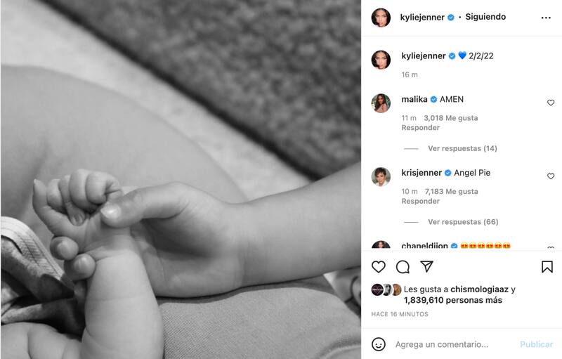 Con una postal en blanco y negro, la empresaria presentó a su bebé con Travis Scott a todos sus seguidores. La publicación alcanzó rápidamente millones de "likes" y miles de comentarios felicitando a los padres del nuevo bebé. Kylie Jenner se limitó a solo escribir como pie de foto la fecha 2/2/2022, refiriéndose al día que dio a luz.