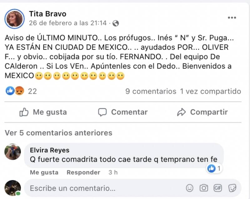 "Aviso de último minuto. Los prófugos Inés y Sr. Puga ya están en Ciudad de México ayudados por Oliver F y obvio cobijada por su tío Fernando del equipo De Calderón. Si Los ven Apúntenles con el Dedo.. Bienvenidos a México", escribió en una publicación en Facebook.