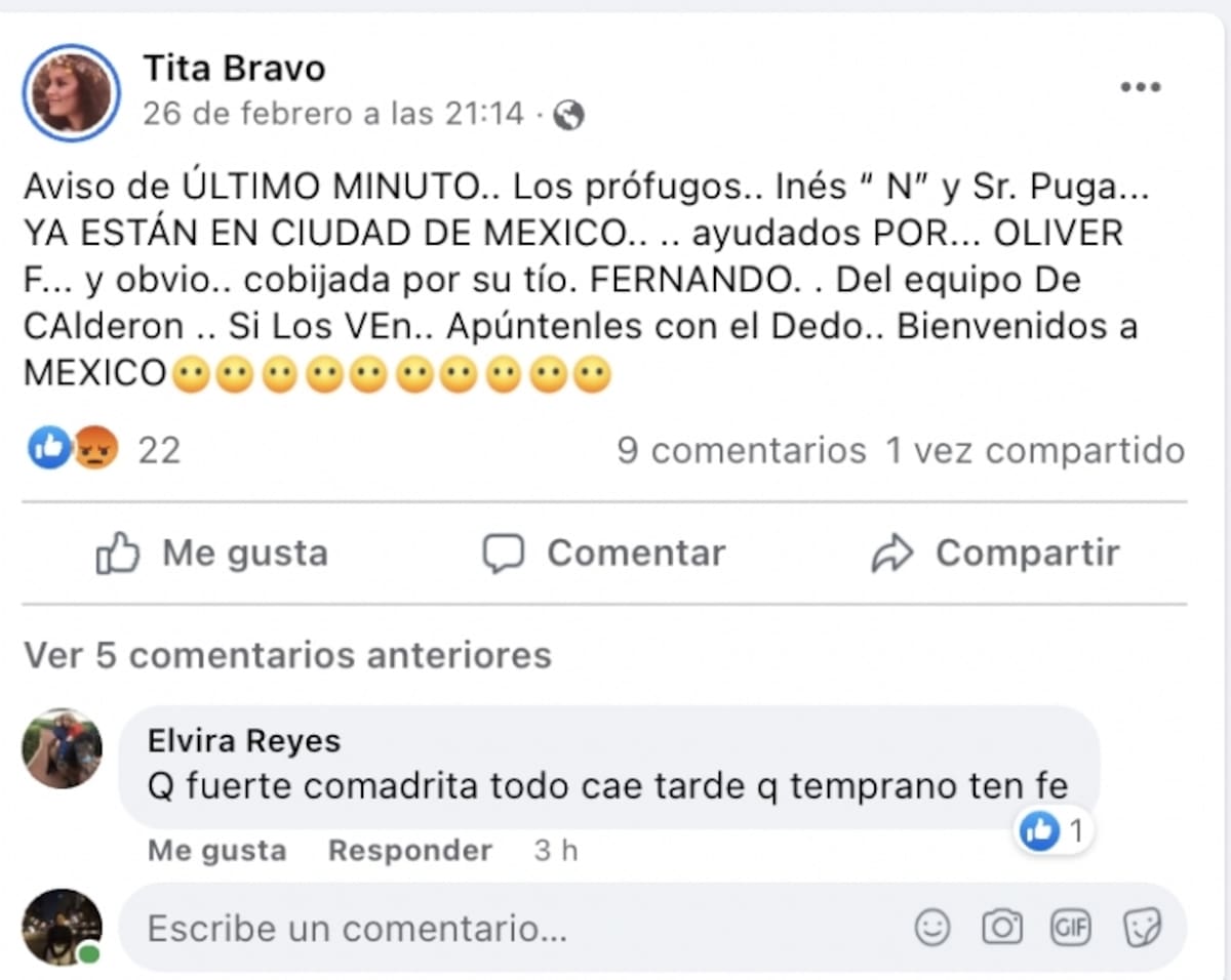 "Aviso de último minuto. Los prófugos Inés y Sr. Puga ya están en Ciudad de México ayudados por Oliver F y obvio cobijada por su tío Fernando del equipo De Calderón. Si Los ven Apúntenles con el Dedo.. Bienvenidos a México", escribió en una publicación en Facebook.