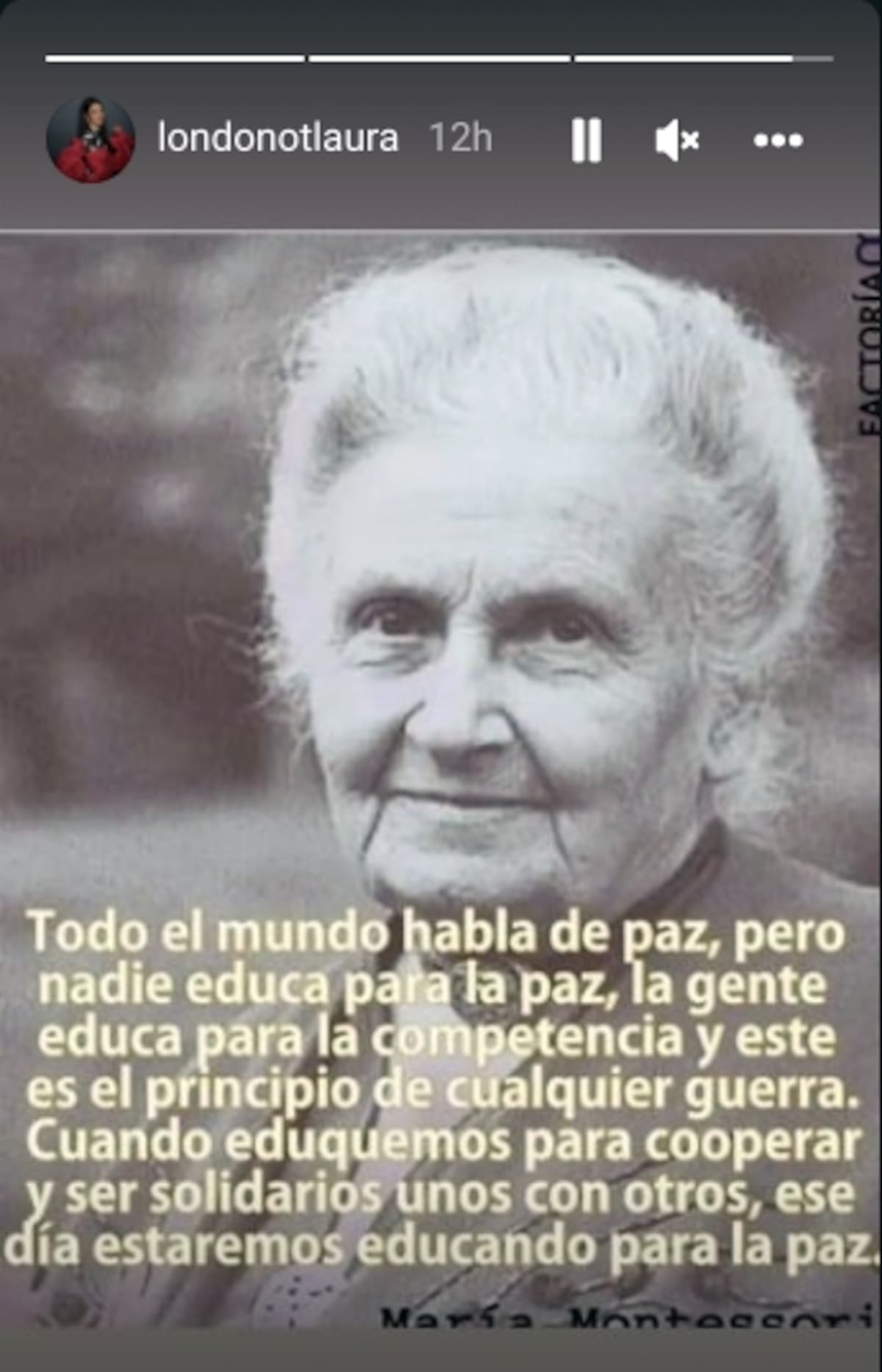Y no solamente eso. En sus historias de Instagram, Laura Londoño colgó otra imagen, esta de María Montessori, con un texto superpuesto en el que se lee: "Todo el mundo habla de paz, pero nadie educa para la paz, la gente educa para la competencia y este es el principio de cualquier guerra. Cuando eduquemos para cooperar y ser solidarios unos con otros, ese día estaremos educando para la paz".