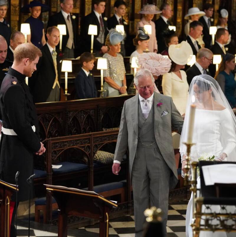 En la instantánea se puede ver a Meghan Markle caminando hacia el altar del brazo del príncipe Carlos el día de su boda con el príncipe Harry en 2018. La exactriz, quien no tiene una buena relación con su padre, fue acompañada por su suegro por el pasillo de la capilla de San Jorge del Castillo de Windsor.