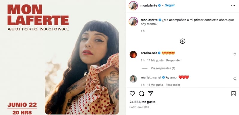 Con el mensaje "¿Me acompañan a mi primer concierto ahora que soy mamá?" puso un flyer sobre su presentación del 22 de junio en el Auditorio Nacional de Ciudad de México, que será su primer concierto del año, luego del espectacular cierre que tuvo en el Teatro Metropólitan de la capital mexicana en diciembre de 2021.