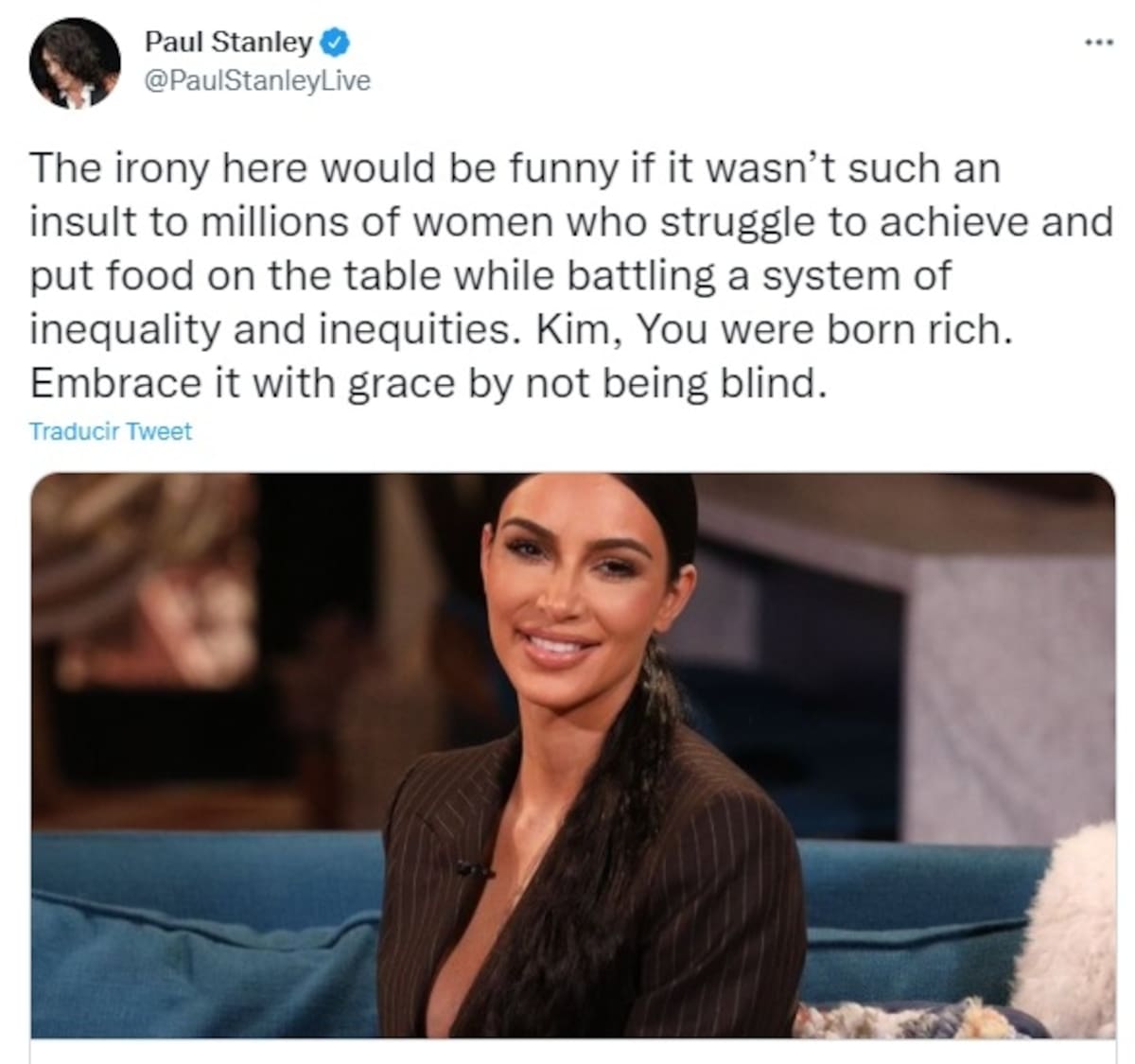 A esa crítica se sumó la voz de Kiss, Paul Stanley, quien a través de su cuenta de Twitter le mandó un mensaje a la pareja de Pete Davidson: "Kim, naciste rica".