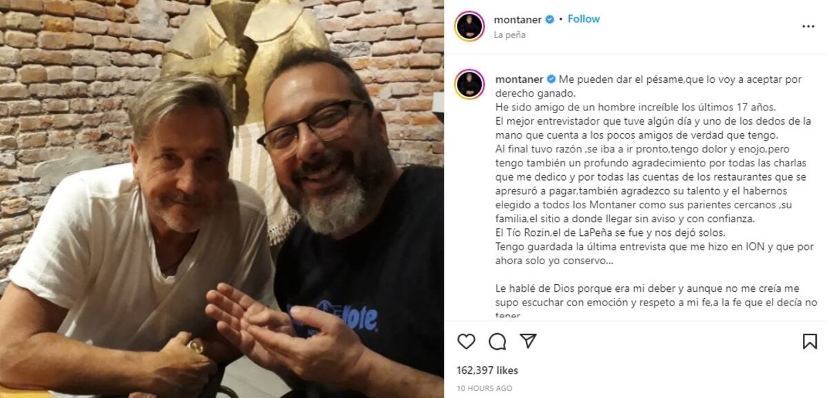 "El Tío Rozin, el de La Peña se fue y nos dejó solos. Tengo guardada la última entrevista que me hizo en ION y que por ahora solo yo conservo…", contó Ricardo Montaner, para luego asegurar que "estoy seguro que Dios en su infinita misericordia ya lo recibió allá arriba en la cima del cielo, donde deben llegar a descansar las buenas personas".