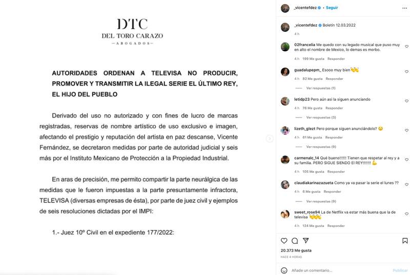 Por la mañana de este sábado, comenzó a circular la noticia de que la Dinastía Fernández había presentado una demanda en contra de Televisa por supuestas violaciones a relaciones extracontractuales, derecho de marca y uso indebido del nombre artístico registrado, hasta hace algunas horas, esto solamente era un supuesto, pero fue la misma familia del cantante quien decidió utilizar las redes sociales para confirmarlo.