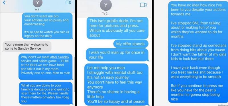 Las declaraciones de Kanye West ocurren minutos después de que el comediante Dave Sirus, quien ha trabajado con Pete Davidson como escritor en "Saturday Night Live" compartiera en su cuenta de Twitter una serie de capturas de pantalla que muestran los mensajes que Ye ha intercambiado con su amigo en Instagram.