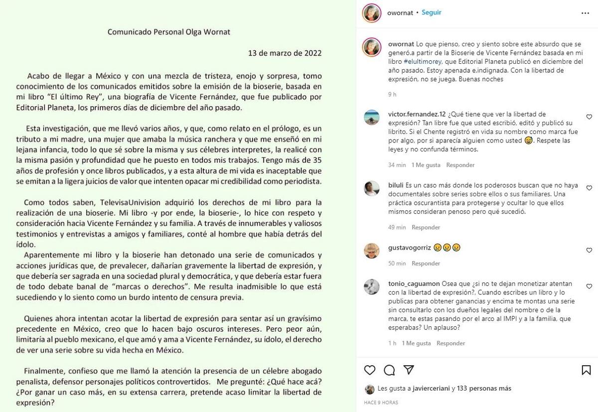 Olga Wornat, autora del libro "El Último Rey" cuyo contenido inspiró la bioserie serie de Vicente Fernández llamada "El último rey: El hijo del pueblo" -producida por Televisa Univisión-, reaccionó a la demanda que emprendió la familia Fernández para evitar que salga al aire.