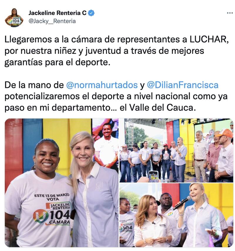 También se quedó sin curul la doble medallista olímpica Jackeline Rentería, quien anunció en octubre su deseo de aspirar a la Cámara por el Valle del Cauca. Una votación que llegó solo a los 2,641 votos, mientras que la última curul se conseguía con más de 47 mil.