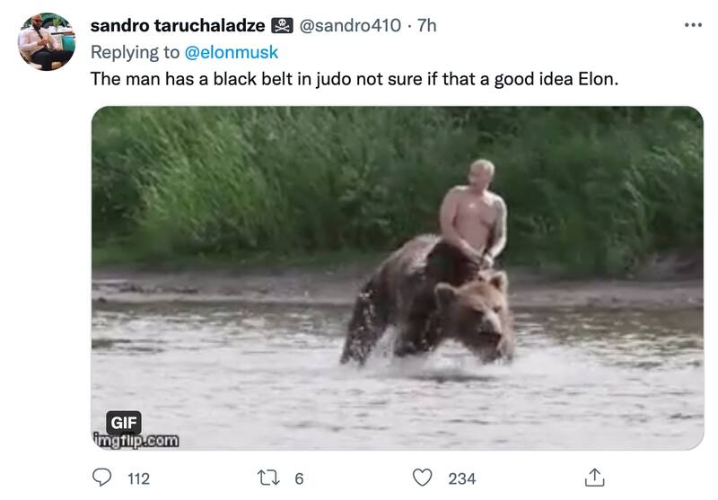 Lamentablemente, fans no han apoyado esta propuesta de Musk, pues a pesar de ser valiente, no es cinta negra en Taekwondo como Putin, ni tampoco tiene experiencia como agente secreto, a diferencia del ex agente de la KGB.