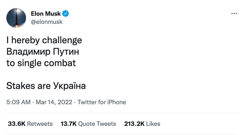 Elon Musk ha retado al presidente de Rusia, Vladimir Putin a una pelea, escribiéndole a través de redes sociales.