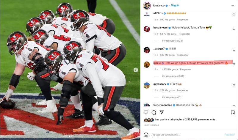 La modelo reaccionó públicamente a la noticia de que su esposo decidió regresar a la NFL. "¡Aquí vamos de nuevo! ¡Vamos amorosos! ¡Vamos Bucs!", escribió Gisele en la publicación de su famoso esposo.