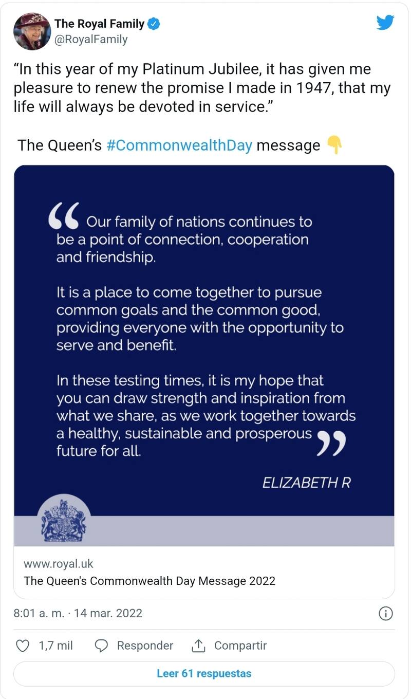 La Reina Isabel refrendó su "servicio" a Gran Bretaña y a los 54 países miembros de la Commonwealth. El lunes la monarca publicó su mensaje anual con motivo del Día de la Commonwealth, evento en el que fue representada por Carlos, el príncipe de Gales.
