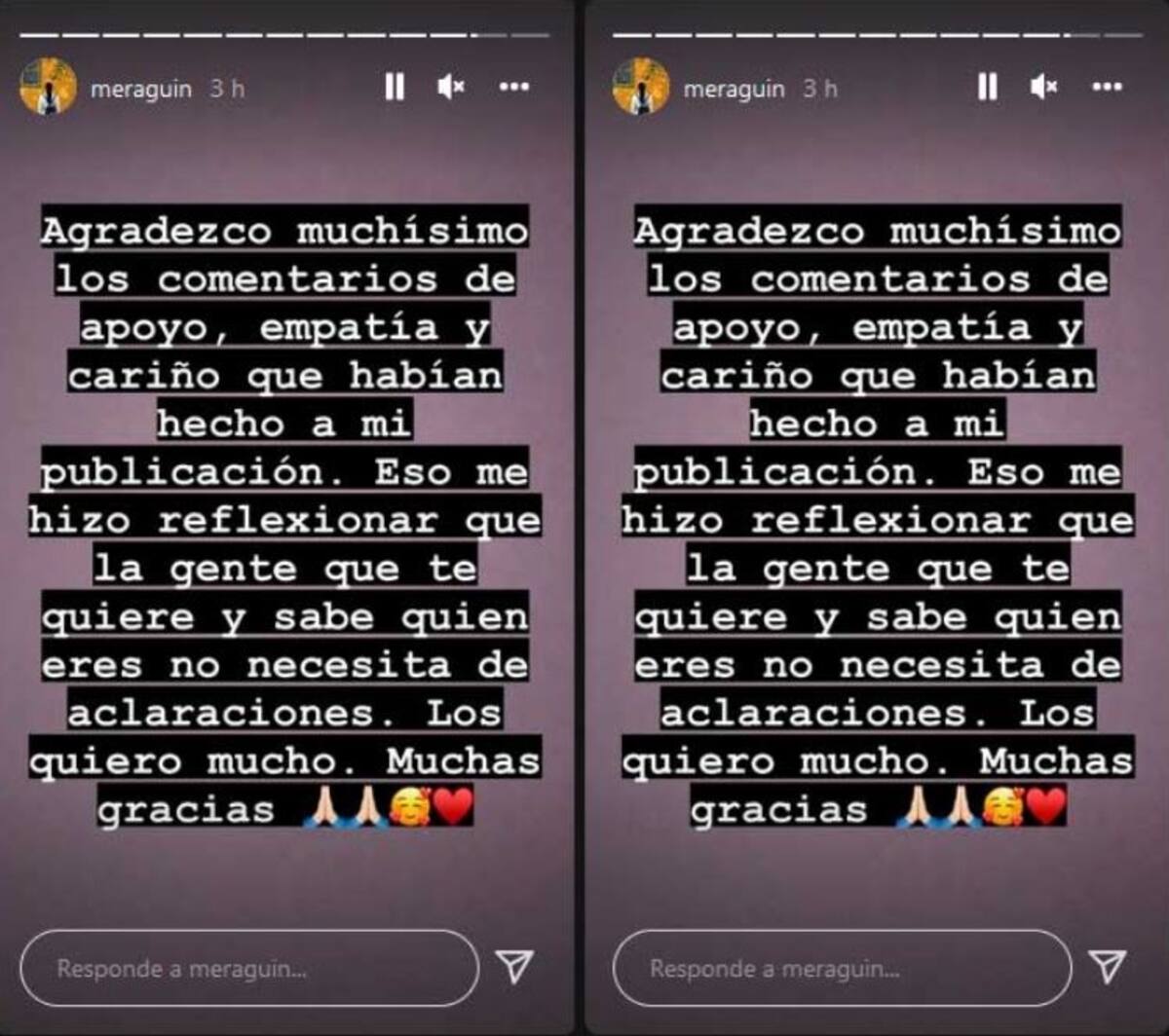 "Que me diga de frente si alguna vez me entrevistó (...) ¡Qué fácil es ponerte a hablar o escribir de la vida de los demás! A mí no me involucren ni me difamen en situaciones en las que nada he tenido que ver", agregó en el poderoso mensaje que publicó en Instagram Stories, que minutos después borró.