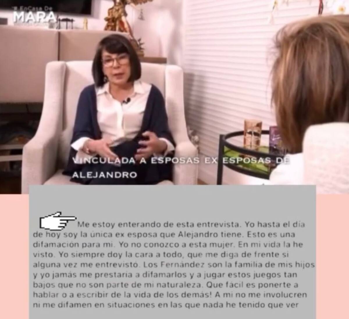 "Yo hasta el día de hoy soy la única exesposa que Alejandro (Fernández) tiene. Esto es una difamación para mí. Yo no conozco a esta mujer. En mi vida la he visto", escribió al pie de una captura de pantalla de la entrevista de Olga Wornat con Mara Patricia Castañeda para su canal de YouTube.