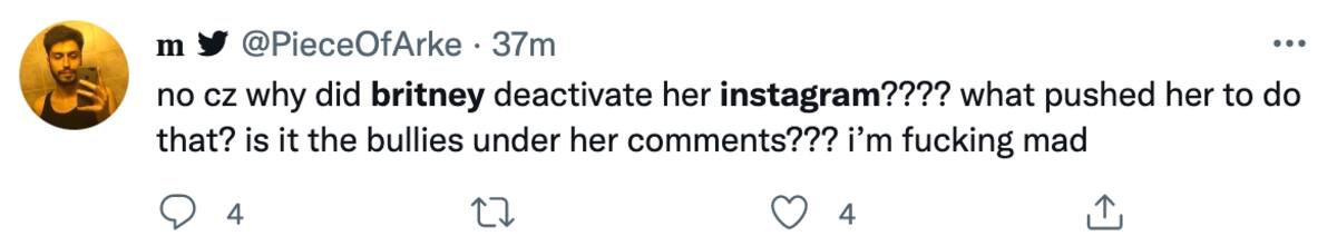 “¿Por qué Britney desactivó su Instagram? ¿Qué la empujó a hacerlo? ¿Son los bullies en sus comentarios? Estoy muy enojado”.