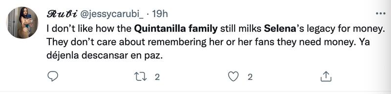 “No me gusta cómo la familia Quintanilla sigue sacando el legado de Selena por dinero. No les importa recordarla o a sus fans, necesitan trabajo. Ya déjenla descansar en paz”.