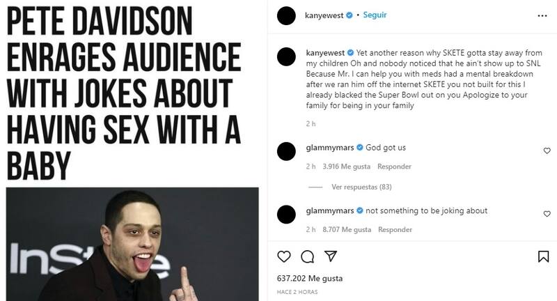 La ofensiva de Kanye West contra Pete Davidson continua, luego de que el domingo se filtraran los mensajes que el habría mandado el comediante al rapero para poder juntarse a conversar y poner un fin a los ataques del ex de Kim Kardashian.