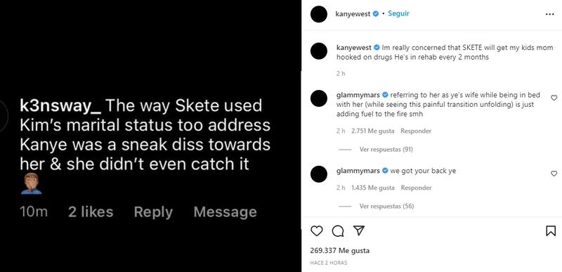 "Estoy realmente preocupado de que SKETE haga que la mamá de mis hijos se vuelva adicta a las drogas", escribió Kanye West en su cuenta de Instagram, agregando que el el comediante pasa en rehabilitación "cada 2 meses".