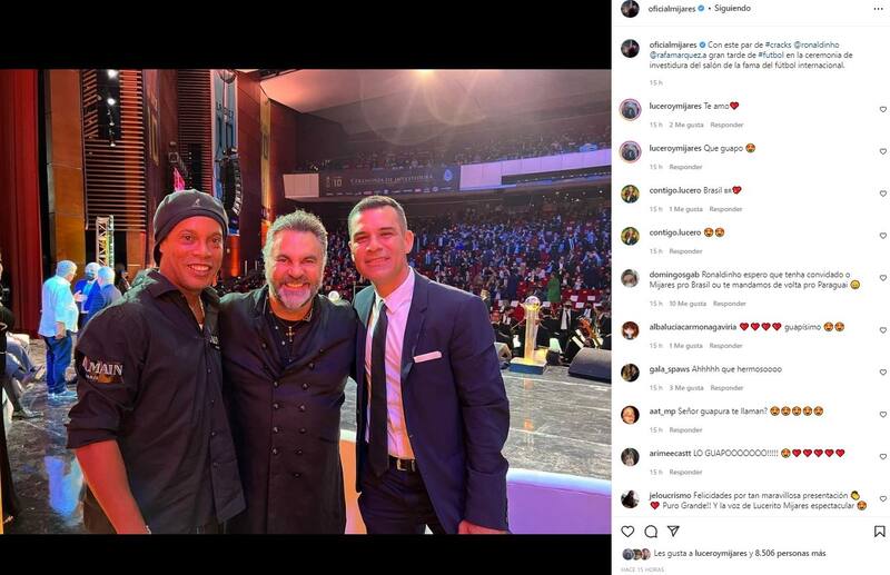 “Con este par de #cracks @ronaldinho @rafamarquez.a gran tarde de #futbol en la ceremonia de investidura del salón de la fama del fútbol internacional”, escribió.