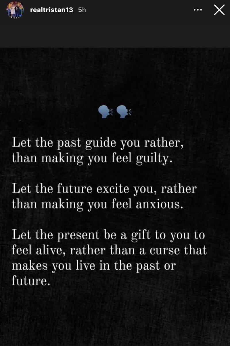 Tristan Thompson compartió en su cuenta oficial de Instagram un mensaje sobre cómo aceptar el pasado, el presente y el futuro. "Deja que el pasado te guíe en vez de que te haga sentir culpable", comenzó.