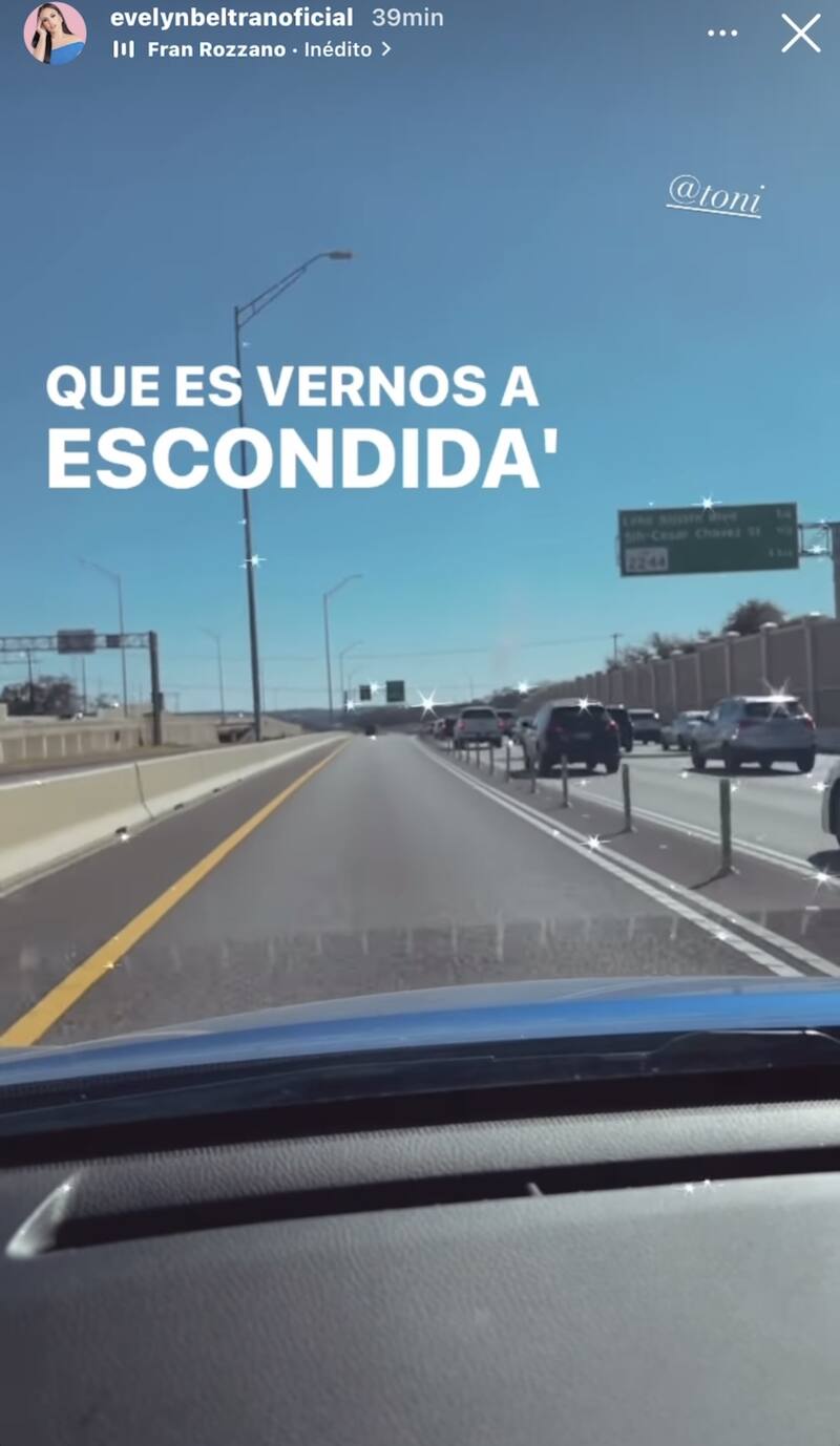 "Que es un secreto que te beso a veces y lo de después solo tú lo ves. La gente no imagina lo que los dos tenemos, que es vernos a escondidas. Es un amor inédito, real…", se escucha en la historia que Evelyn Beltrán compartió etiquetando a Toni Costa.