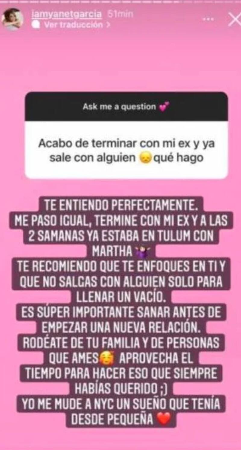 A la modelo le preguntó una seguidora: "Acabo de terminar con mi ex y ya sale con alguien, ¿qué hago?". A lo que respondió de manera contundente: "Te entiendo perfectamente. Me pasó igual, terminé con mi ex y a las dos semanas ya estaba en Tulum con Martha". Agregó después un consejo a su seguidora, diciéndole que siga sus sueños y se enfoque en ella hasta sanar su corazón.