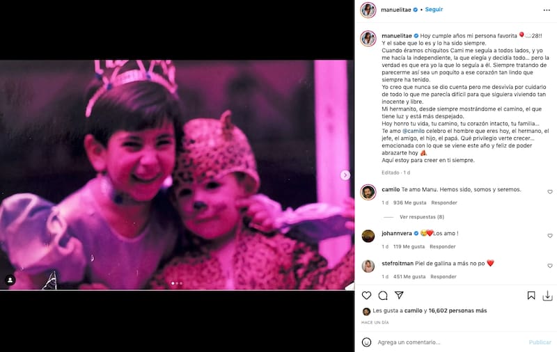"Te amo Camilo, celebro el hombre que eres hoy: el hermano, el jefe, el amigo, el hijo, el papá. Qué privilegio verte crecer…", escribió la hermana de Camilo.