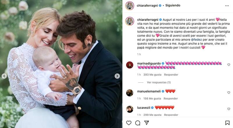 En el posteo que en una hora casi alcanza el millón de "megustas", Chiara, quien se describe a sí misma como emprendedora digital, añadió: "Contigo nos convertimos en una familia, la familia como tú dices. Gracias por elegirnos para ser tus padres, y un agradecimiento especial a mi amor @fedez por crear este sueño conmigo. Mis mejores deseos para ti también, amor, eres el mejor papá del mundo para nuestros cachorros".