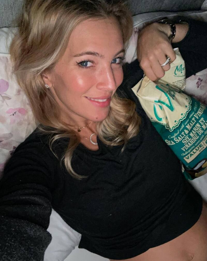 “De a poquito se va asomando. Por acá con algunos antojos”, escribió junto a una foto en donde se le ve en cama con una bolsa de papas fritas y su pancita.