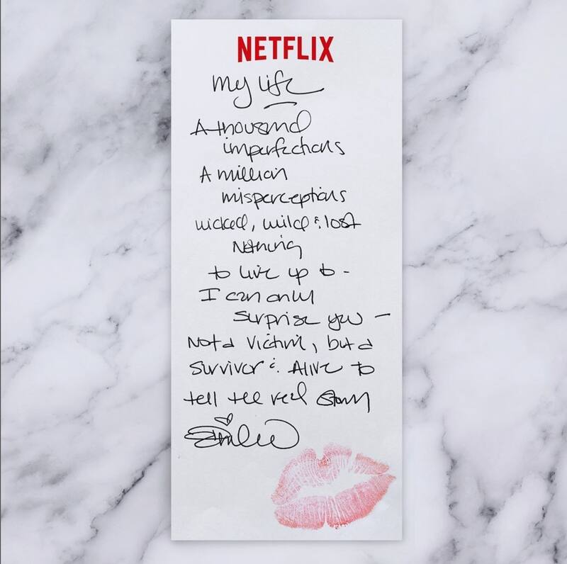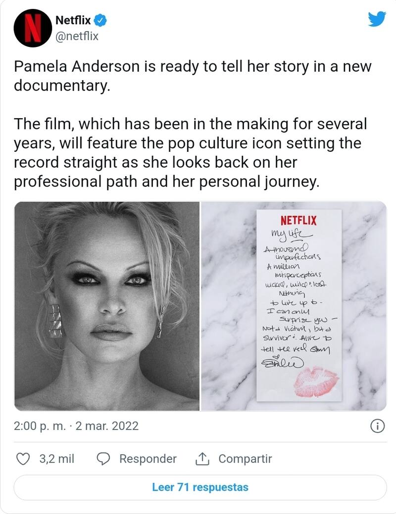 El anuncio se hizo en las redes sociales, acompañado de una nota de Anderson escrita a mano con el membrete del gigante del streaming: "Mi vida: mil imperfecciones, un millón de percepciones erróneas", escribe. "Malvada, salvaje y perdida. Nada que cumplir, solo puedo sorprenderte. No una víctima, sino una sobreviviente. Y vivo para contar la historia real".