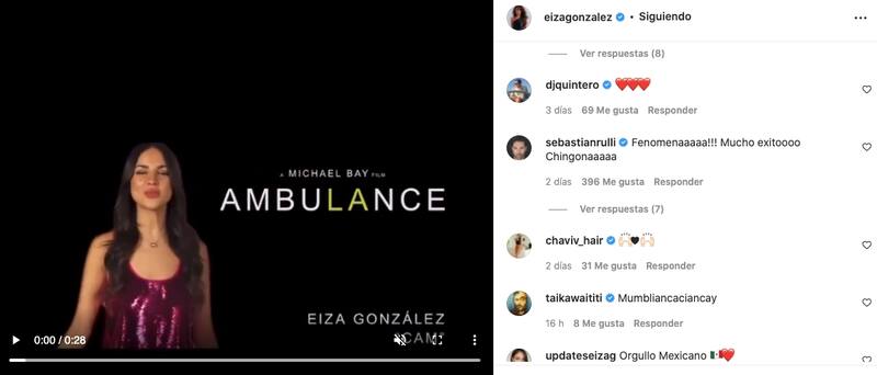 Eiza acompañó el clip con el mensaje: "México y Sudamérica HOY están en todos los cines!! @ambulancethemovie feliz de compartir con mi país primero! Disfrútenla y vayan con sus amigos. Mándenme sus reactions y comentarios no se la pierdan los amo!!!".
