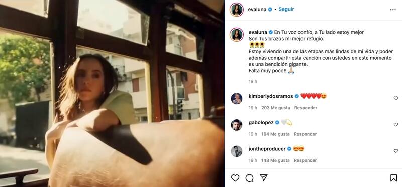 En las imágenes, se ve a Evaluna como única pasajera de un tranvía que circula por la ciudad de Buenos Aires. Acompañó el clip de un mensaje en cuyas primeras líneas compartió unos versos del nuevo tema que todavía no tiene fecha de lanzamiento: "En tu voz confío, a tu lado estoy mejor, son tus brazos mi mejor refugio".