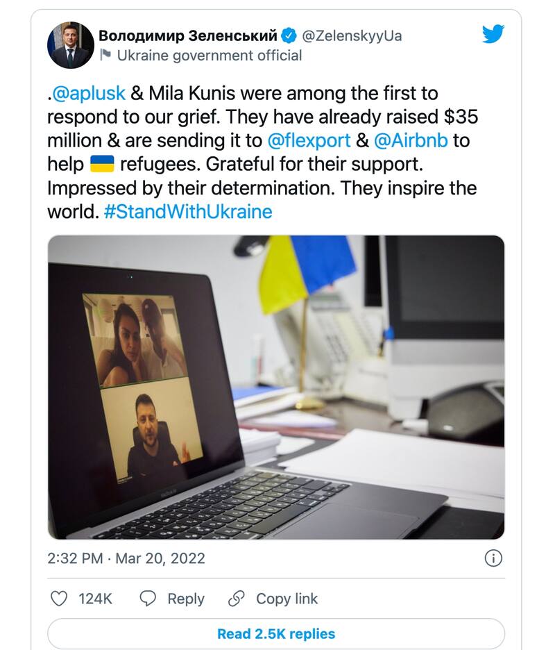 Zelensky les mandó un mensaje en Twitter en donde escribió: “Ashton Kutcher y Mila Kunis fueron de los primeros en responder a nuestro pesar. Han juntado $35 millones y lo mandarán a Flexport y a Airbnb para ayudar a los refugiados. Estoy agradecido con su apoyo. Impresionado por su determinación. Inspiran al mundo”.