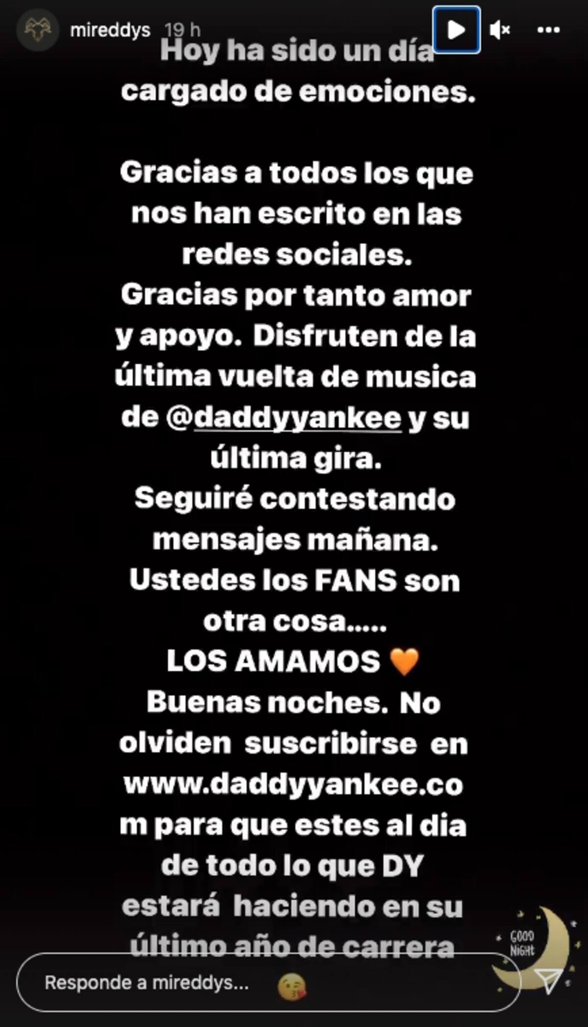 "Gracias por tanto amor y apoyo. Disfruten de la última vuelta de música de @daddyyankee y su última gira. Seguiré contestando mensaje mañana. Ustedes los FANS son otra cosa... LOS AMAMOS", agregó.