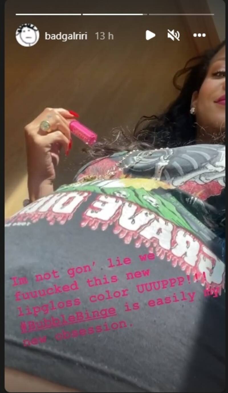 Además, mostró un nuevo labial de su marca de cosméticos Fenty Beauty, de un color rosa llamado "bubblebinge", donde se le veían bastante feliz y siguió presumiendo de su baby bump.