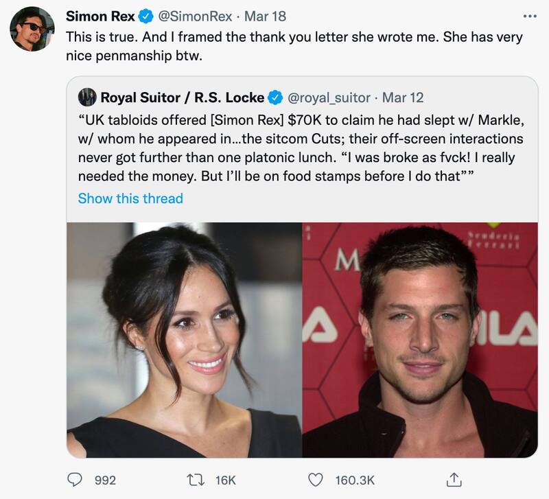 Simon Rex y Meghan Markle trabajaron juntos en un episodio de la serie “Cuts” en 2005 y aunque ambos solamente tuvieron una relación de trabajo, se les vio comiendo juntos, por lo que los tabloides pensaron que podrían aprovecharse de eso.