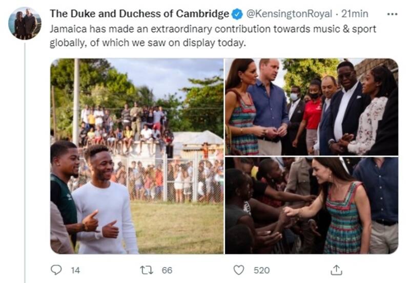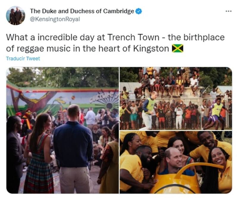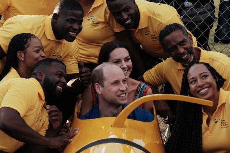 Rebecca English, editora real del Daily Mail, compartió distintos registros de la visita de Kate Middleton y el príncipe Williams a Trench Town en los que se le ve a la duquesa luciendo un colorido vestido a cargo de la diseñadora jamaicana Lashawndla Bailey-Miller. En ellos se puede ver al duque conversando con el equipo de Bobsleigh jamaicano, siendo sorprendido por la velocidad que alcanzan estos vehículos, mientras se montaba dentro de uno.