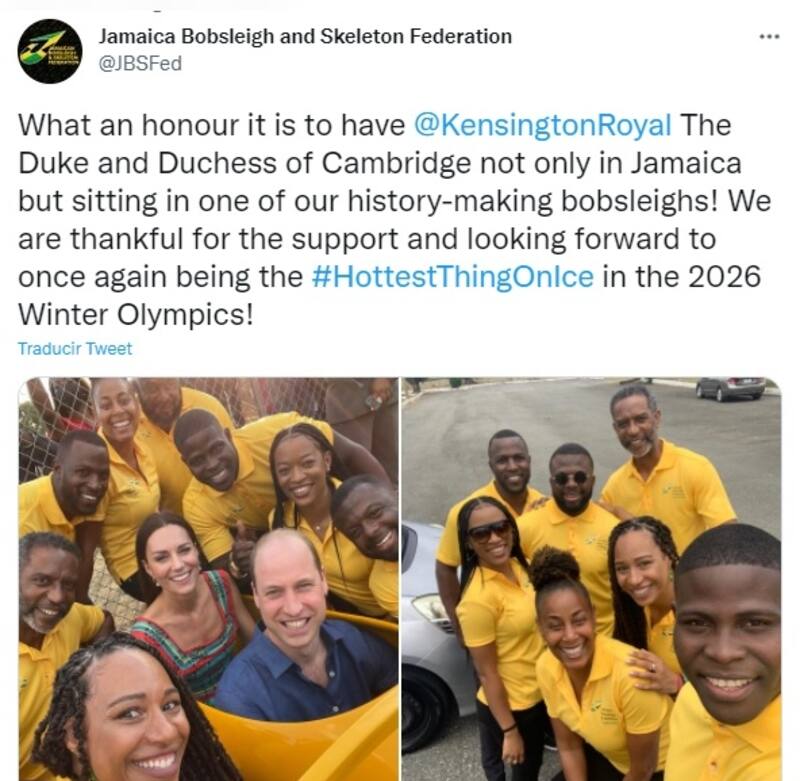"¡Qué honor es tener a @KensingtonRoyal, el duque y la duquesa de Cambridge, no solo en Jamaica sino sentados en uno de nuestros trineos históricos! ¡Estamos agradecidos por el apoyo y esperamos ser una vez más #HottestThingOnIce en los Juegos Olímpicos de Invierno de 2026!", destacó la cuenta oficial de la Federación de Bobsleigh y Skeleton de Jamaica