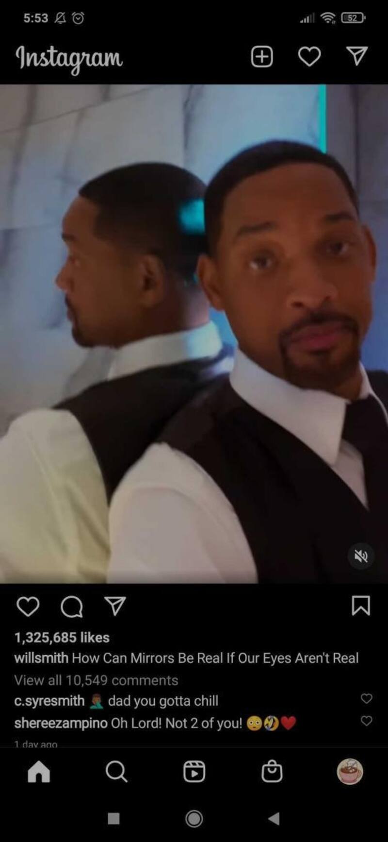 Will Smith subió un video a Instagram: "¿cómo pueden ser reales los espejos si nuestros ojos no son reales?", tituló el actor al clip en el que hizo un juego de espejos con un montaje. Una pregunta que invitaba a sus seguidores a reflexionar de una forma creativa.