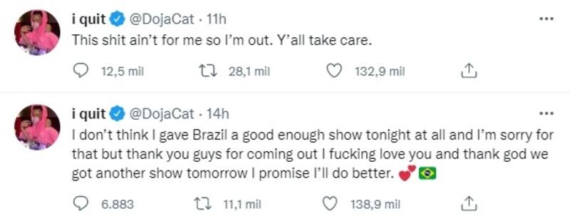 Pese a que los tweets de Doja Cat sobre el público paraguayo fueron borrados, la voz de "Woman" compartió dos mensajes más que han preocupado a sus fanáticos. La cantante dio señales de un posible retiro de la música, tras su desencuentro con sus fans y lo que ella considero un mal concierto en Brasil.