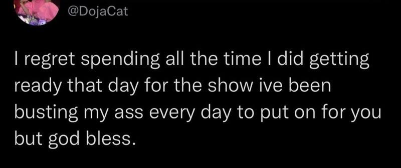 Antes, Doja Cat había planteado que todo le importaba un carajo, que renunciaba y que no podía esperar por desaparecer. "Todo está muerto para mí, la música está muerta y soy una jodida tonta por pensar que estaba hecha para esto", agregó.