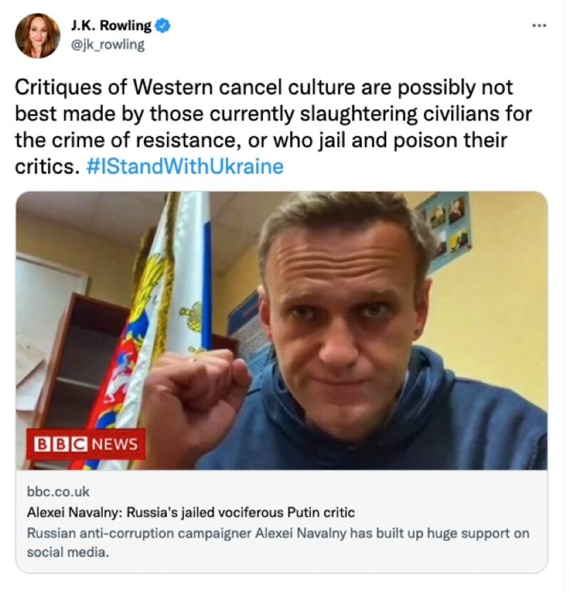Rowling aludió al comentario de Putin con un posteo en Twitter: "Las críticas a la cultura de cancelación occidental posiblemente no sean las mejores hechas por aquellos que actualmente matan a civiles por el crimen de resistencia, o que encarcelan y envenenan a sus críticos. #EstoyConUcrania".