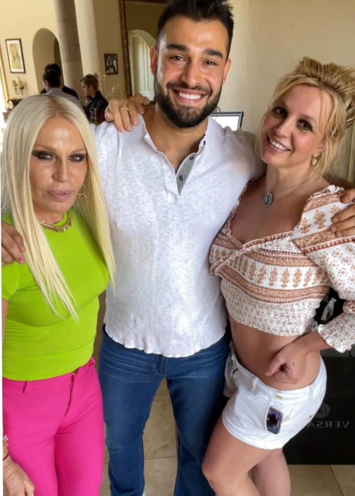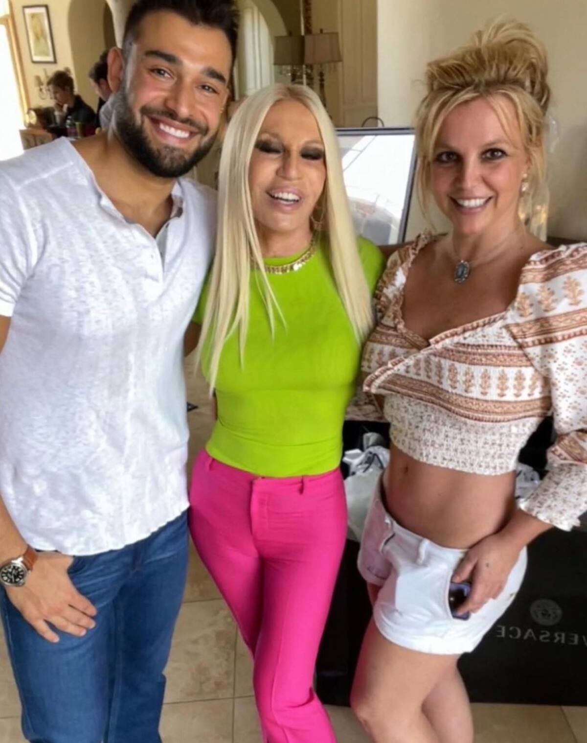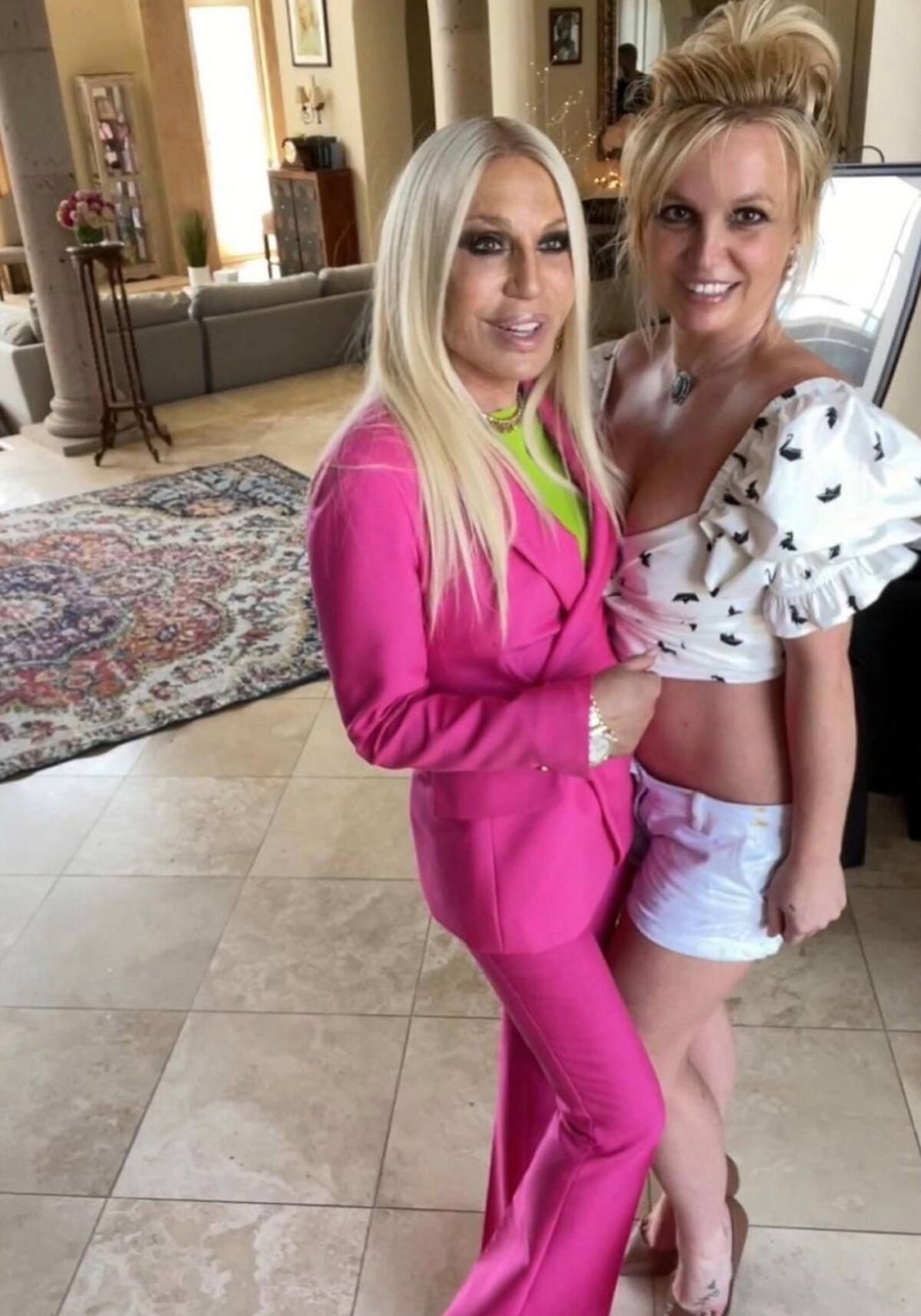 En ambas fotos aparece Brit luciendo su figura en crop top y shorts blancos, combinados con unos tacones cafés, mientras que la hermana de Gianni Versace portó unos pantalones rosas y una camisa color verde.