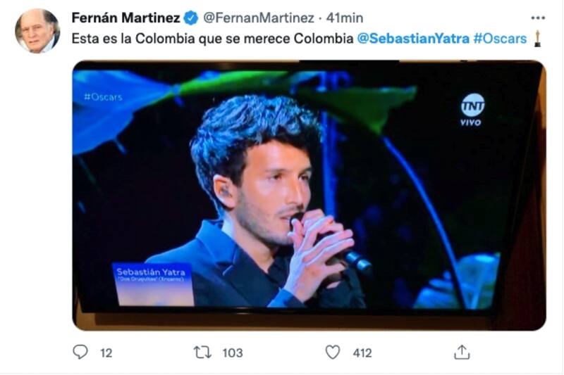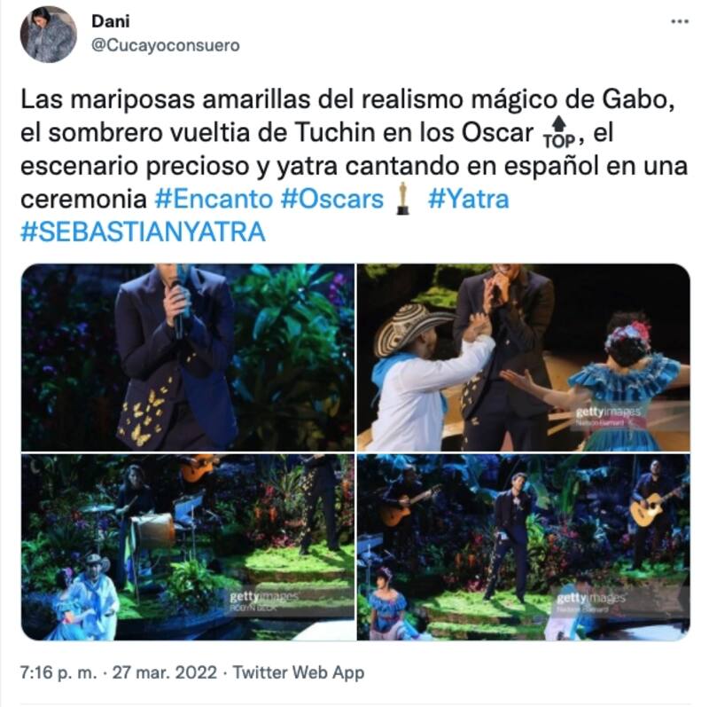 El colombiano tomó el escenario de los Premios Oscar con una presentación que hizo enchinar la piel de toda Latinoamérica, mientras la escenografía remontaba a Colombia, junto con una pareja bailando al ritmo de la canción con vestuarios típicos colombianos.