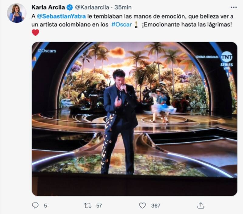 La emoción de Sebastián Yatra traspasó la pantalla, incluso la cámara llegó a capturar sus ojos de ilusión y sus manos temblando, pues previo a los Premios Oscar confesó su emoción por poder presentarse en la premiación.